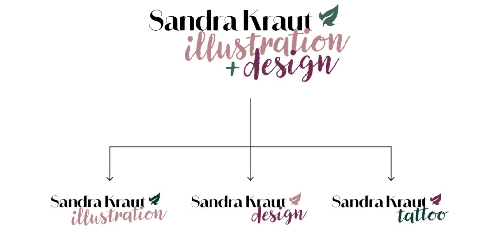 Ich bin vielfältig und mein Logo soll es auch sein. Ich bin als Illustratorin, Grafikdesignerin und Tätowiererin tätig und wollte für jeden Teilbereich ein eigenes Logo, das ich im speziellen Fall verwenden kann. Die Basis – mein Name mit dem Efeu-Blatt – bleibt gleich, lediglich der Claim darunter ändert sich. Alle Logos bewegen sich in der definierten Farbwelt.