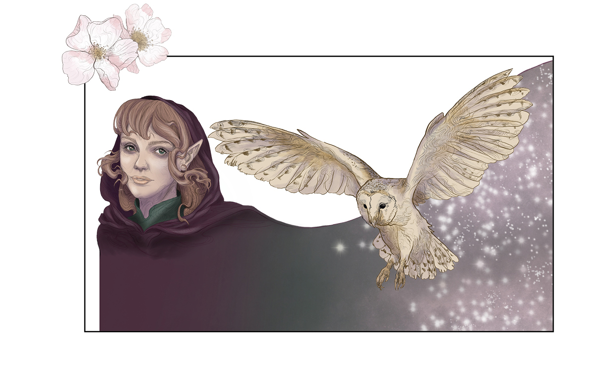 Das Key Visual soll allen zeigen, für welche Motive ich brenne und für was ich gebucht werden mag, wo meine Stärken und Expertise liegen. Es zeigt eine Elfe mit einem geheimnisvollen Umhang, Blüten und einer Schleiereule. Außerdem greift die Illustration die Farben aus dem Logo-Redesign wieder auf.